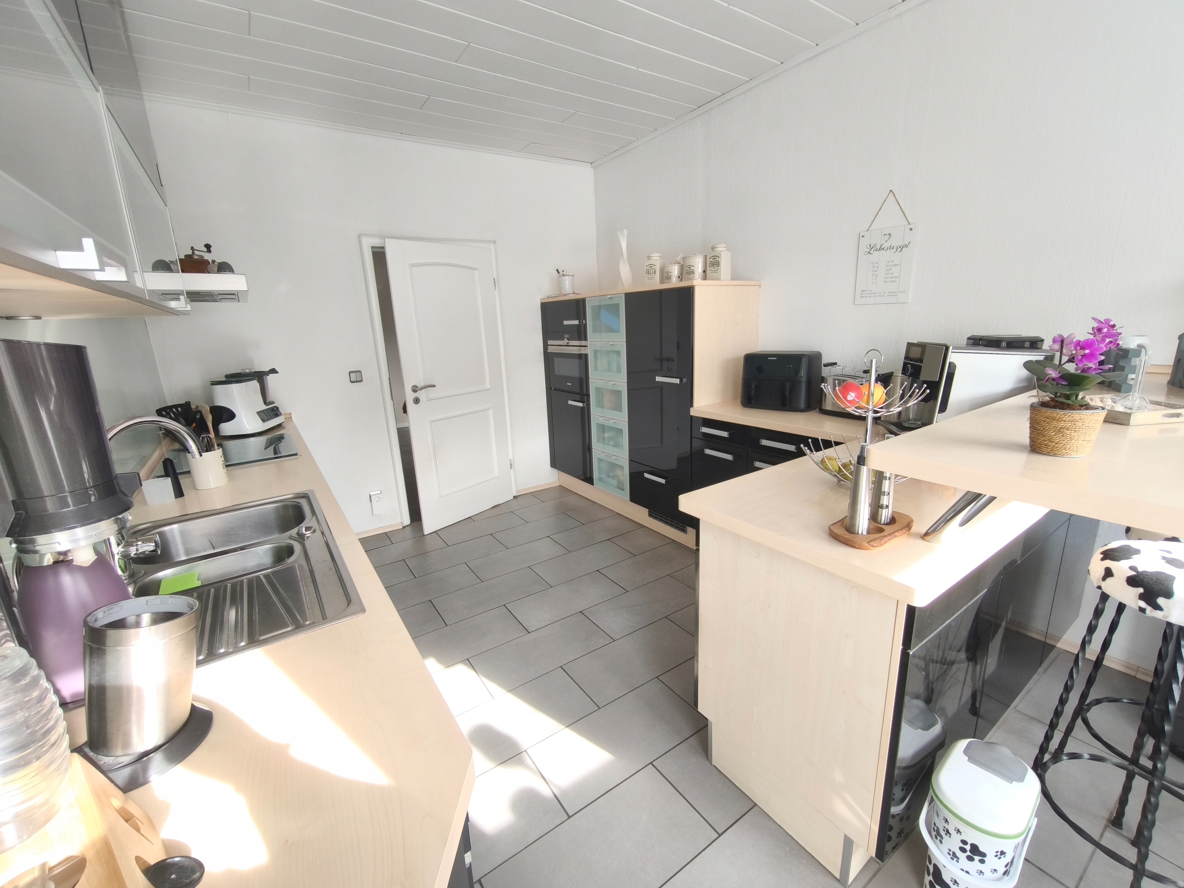 Die geräumige Küche, praktisch geschnitten und zugleich gemütlich, wird schnell zum Dreh- und Angelpunkt des Alltags. Durch den Esstisch im hinteren Bereich, zeigt sich die Küche ebenso funktional wie charmant.