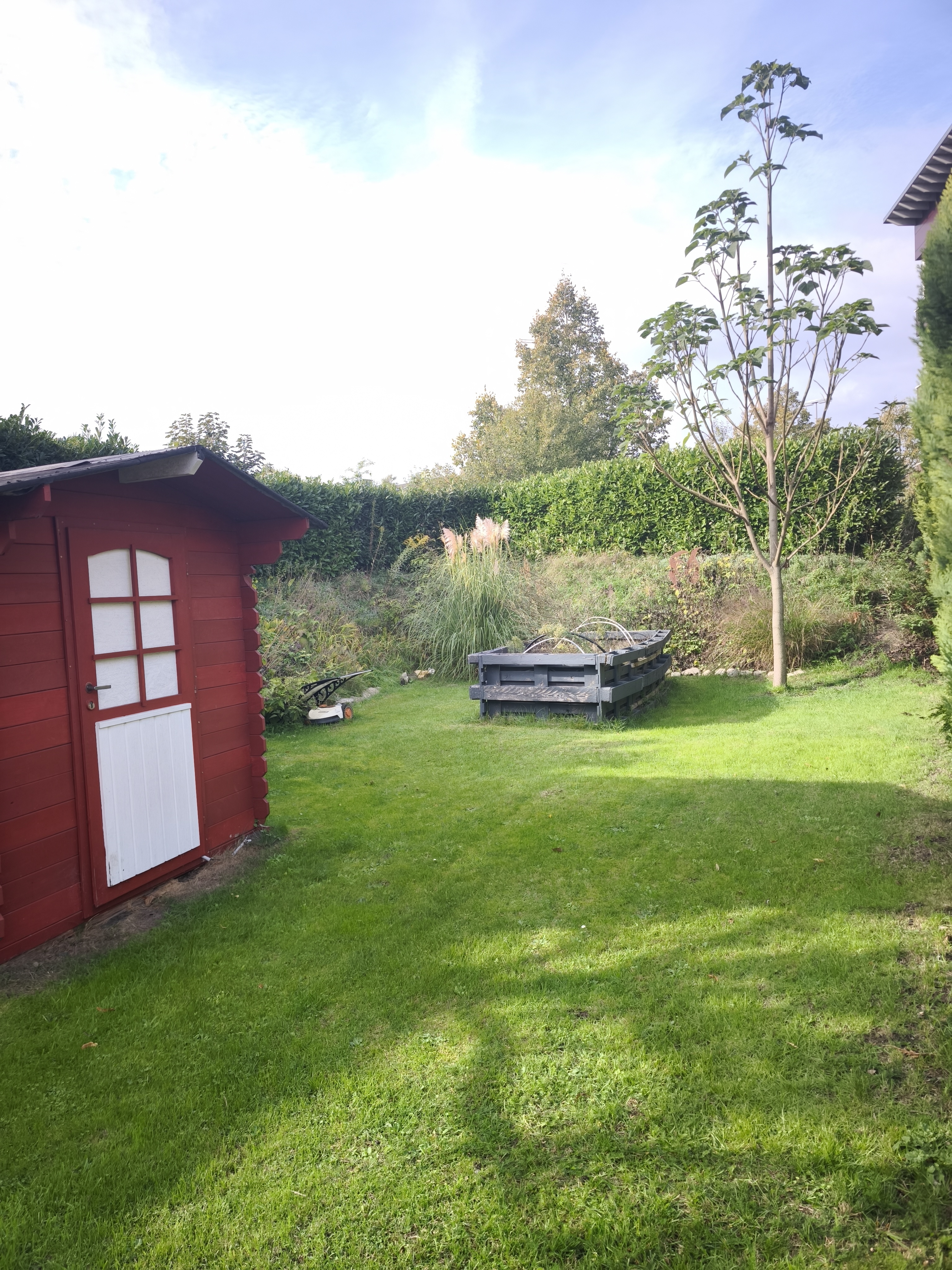 Der Außenbereich ist ein wahres Paradies: Ob Spiel- und Freizeitfläche für Kinder, gemütliche Rückzugsorte im Grünen oder entspannte Stunden – hier findet jedes Familienmitglied seinen Lieblingsplatz. Für Ihr Fahrzeuge steht eine geräumige Garage, direkt am Haus zur Verfügung.